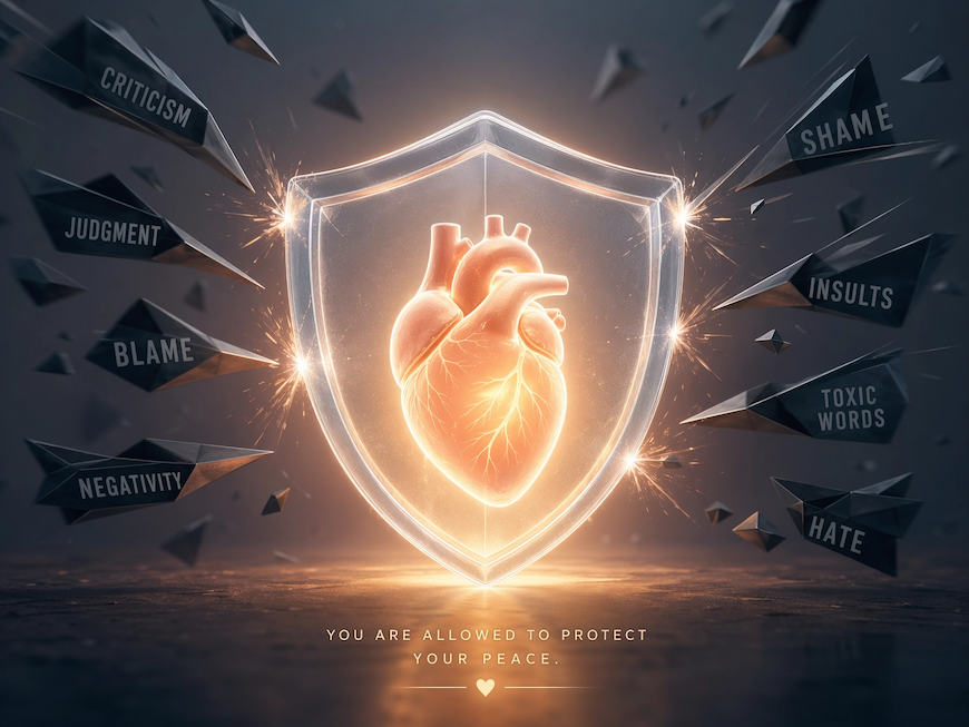 A glowing heart protected by a transparent shield against toxic words and negativity.